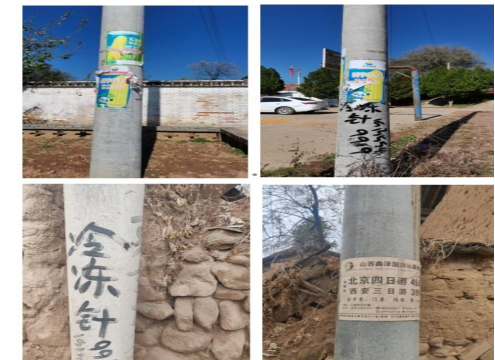 2023年,國網(wǎng)沁縣供電公司(以下簡稱“沁縣公司”)探索出利用廢舊電桿為鳥筑巢的方法,壓降在運線路跳閘率30%。這一實踐為自有電力設(shè)備資源的高效利用探索出新路徑?;诖?,2024年沁縣公司進(jìn)一步探索農(nóng)村在運電桿潛在價值釋放。經(jīng)調(diào)研,沁縣全域533個自然村,平均每個自然村有40基電桿,大約21320基電桿。60%電桿的桿體存在被亂涂亂畫、張貼小廣告等影響鄉(xiāng)村美觀的問題(如圖1),與鄉(xiāng)村振興的時代課題不相適應(yīng);5%緊貼路邊的電桿容易受外力撞擊,造成桿體破損,形成安全隱患;95%以上電桿桿體缺乏管理,電桿下端位置未被有效利用。