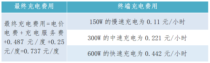 據(jù)市場(chǎng)統(tǒng)計(jì),運(yùn)營商充電服務(wù)費(fèi)一般為:0.4-0.6元/度。為進(jìn)一步降低充電費(fèi)用,引入充電站廣告商,將廣告租金的60%補(bǔ)貼至充電站運(yùn)營商,以降低充電服務(wù)費(fèi),根據(jù)盈利效益測(cè)算,同運(yùn)營商溝通,可降低充電服務(wù)費(fèi)至0.12-0.25元/度,按0.25元/度計(jì)算最終充電費(fèi)用如下表所示。